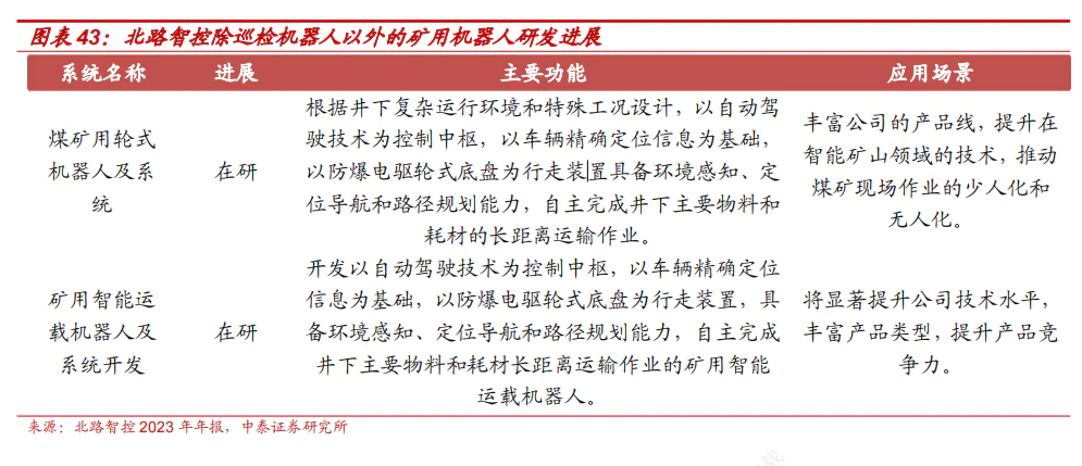 根据2023年年报,公司正在开发煤矿轮式机器人和矿用智能运输机器人,相关系统的研发也在推进,预计未来将扩大矿用智能机器人的覆盖面。
