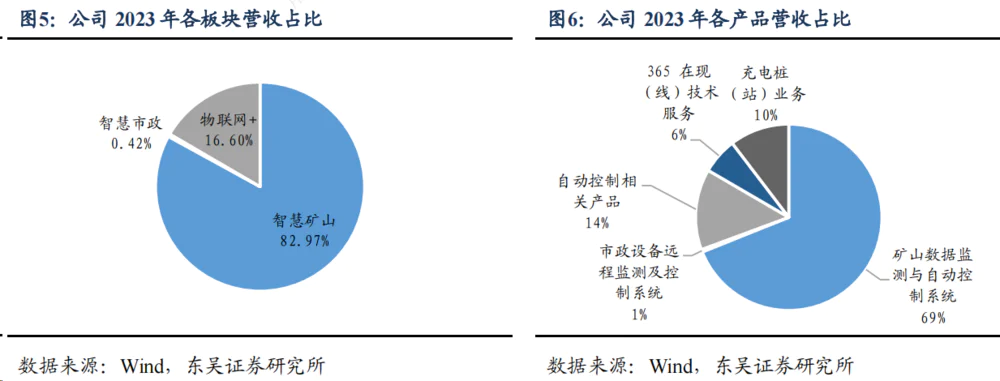 从板块来看,2023年,公司智慧矿业收入占营收总额的83.0%,物联网 收入占全年总收入的16.6%。根据商品划分,矿山数据监控和自动控制系统的收入占比最高,达到69%。新能源充电和换电管理系统业务爆炸式增长。目前已投入社区充电设备约10万台,收入占10%,同比增长10倍。