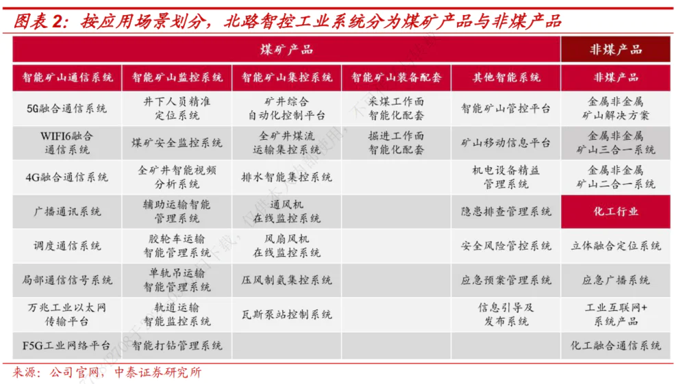 北路智能控制专注于智能矿山全场景应用,涵盖矿山通信、监控、集控系统及设备配套四大类产品。其中,智能矿山通信系统包括人员精准定位系统、矿山网络设备等。智能监控系统包括煤矿安全监控、全煤矿图像监控等。智能集控系统包括煤流、排水、风机等关键环节的智能控制,智能配套设备包括采煤和掘进工作面的智能设备。该公司的商品已经应用于全国1000多个煤矿和非煤矿,并逐步扩展到危险品化工行业,实现跨行业技术复制。