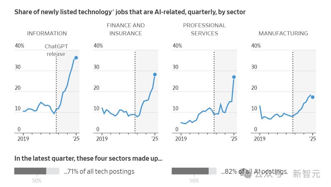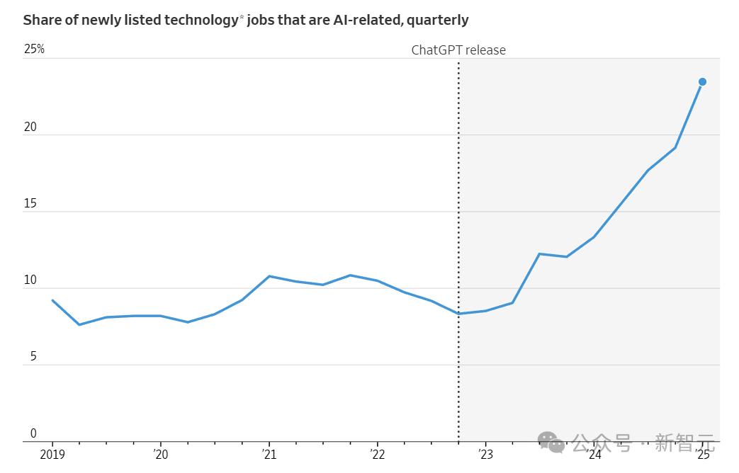 自2022年底ChatGPT发布以来,AI相关岗位招聘增长68%,而同期科技岗位总体减少27%。