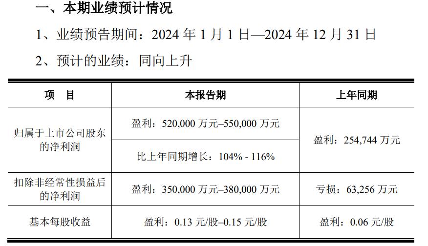 据京东方估计,2024年归母净利润为52亿-55亿元,比去年同期增长104%-116%。