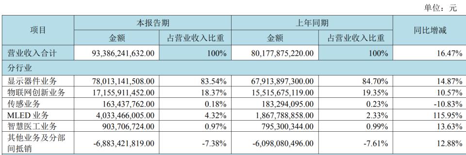 根据京东方2024年上半年的财务报告,MLED业务收入为40.33亿元,占总收入的4.32%,同比增长115.95%。
