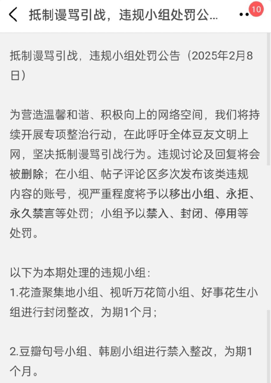 2月,豆瓣花渣集中、视听万花筒、好花生、句点、韩剧等娱乐团队再次迎来一个月的限期整改。豆瓣只能通过这种方式不定期地调控团队中的激烈行为,如引战和辱骂,但很难从根本上避免。