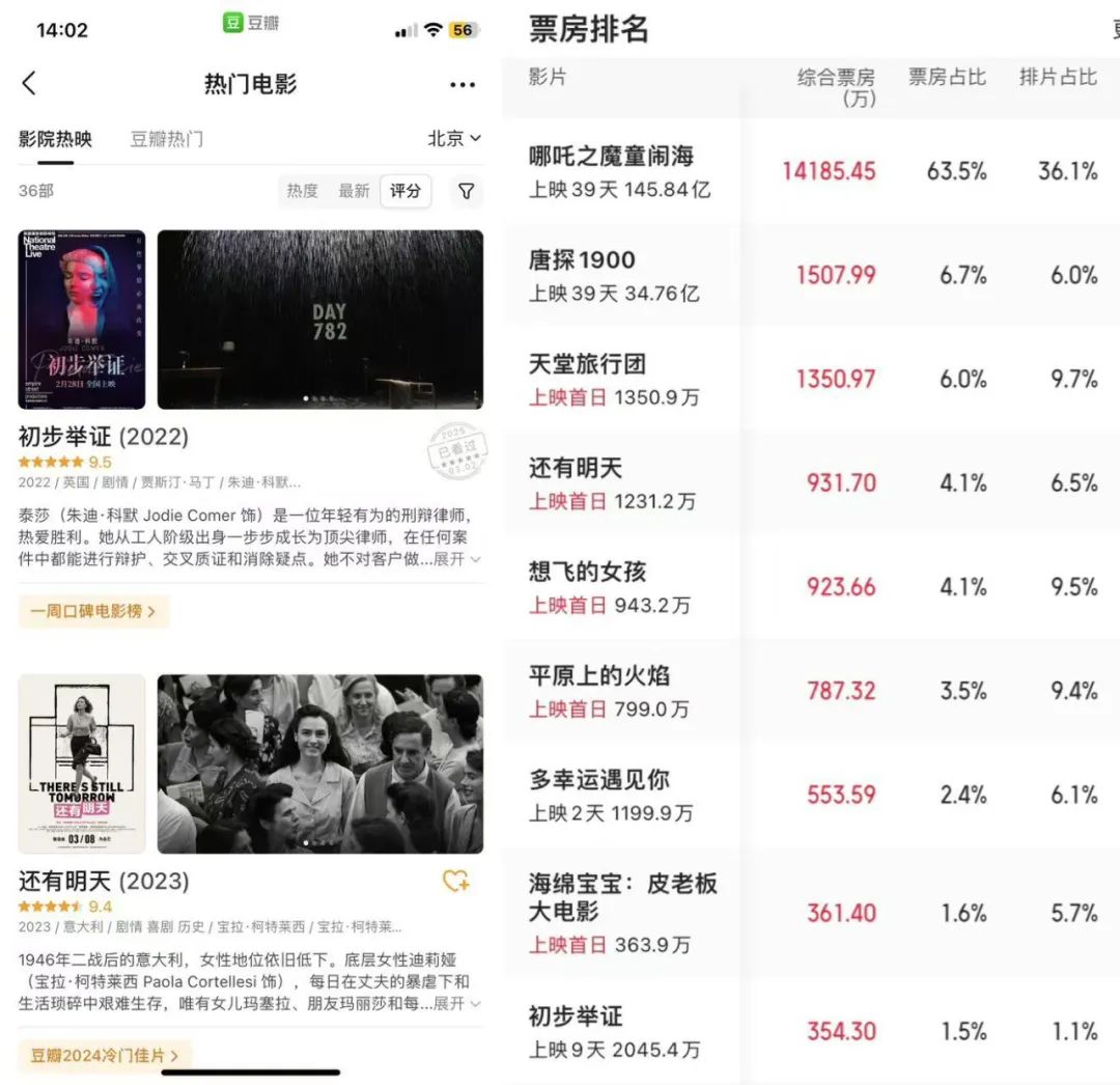 豆评与影视剧市场表现的背离,也成了老生常谈的话题。在过去的几年里,出现了许多国内优秀的豆瓣作品,但电影市场却陷入了严冬。在过去的妇女节,豆瓣9分电影《明天》和《初步证据》的票房并不令人满意,但总是被6.5分的《唐探1900》牢牢压制。