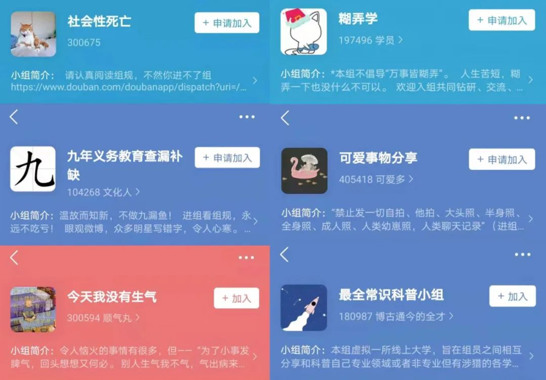 到目前为止,国内社区还没有豆瓣小组那么纯粹。人群的聚集和交流遵循最大程度的自由和公平。因此,你可以在豆瓣上看到各种奇怪的群体。不管小组的主题有多奇怪,组长都可以通过设置自己的门槛来真正聚集志同道合的人,而“私人小组”的出现进一步将豆瓣变成了可以吸收无数秘密需求的海绵。。对豆瓣本身来说,豆瓣小组的意义在于拓宽了用户群体,因为小组类型丰富,间接吸收了更多的群体。