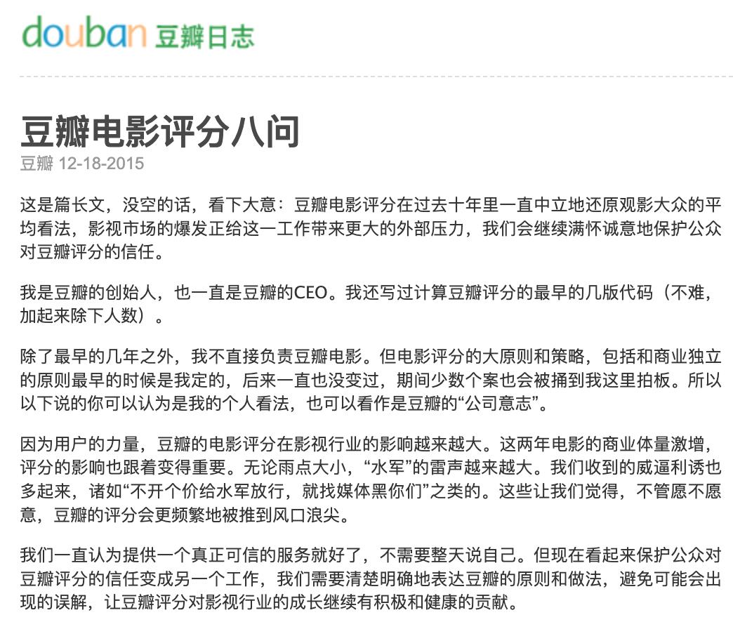 除了“精神角落”,还有一个豆瓣,曾经是一个有趣的灵魂集中地,然后成为粉丝谣言的起源地。豆瓣团队尴尬的“堕落过程”也是中国互联网舆论生态的一面镜子。
