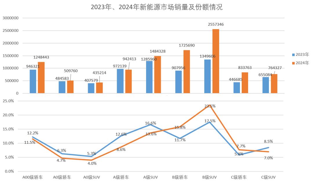 在过去的一年里,整个新能源市场继续飙升,但是对于每一个目标市场来说,发展并不平衡。一个明显的趋势是,A级以上车型的市场份额持续增长,只有A00。、在整个新能源市场中,A0级的份额正在下降。