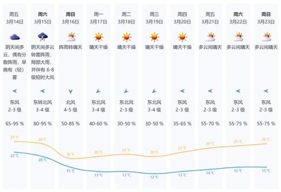 三月十四日,阴天多云,偶有分散阵雨,早晚有(轻)雾;气温22-27℃;2-3级东风;65%-95%的相对湿度。