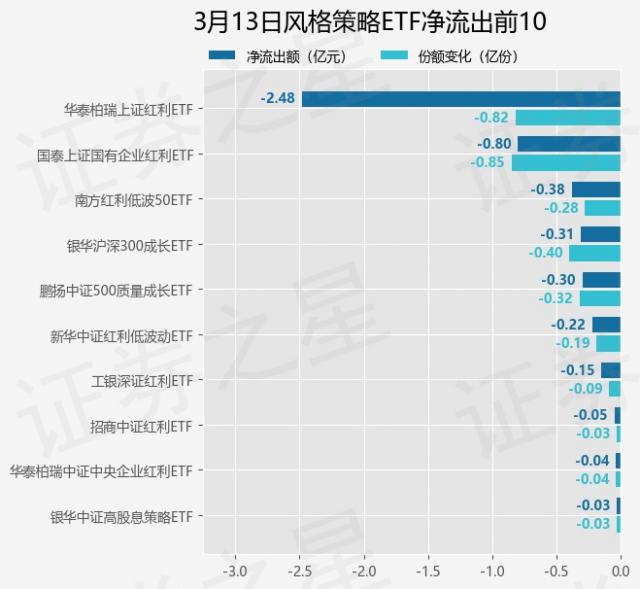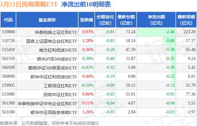 当天有 24 只风格策略 ETF 资金净流出,其中华泰柏瑞上证红利排名第一。 ETF(510880),份额下降 8150.0 万份,净流出额为 2.48 亿元。