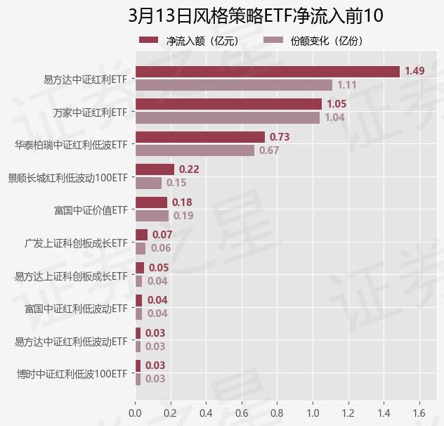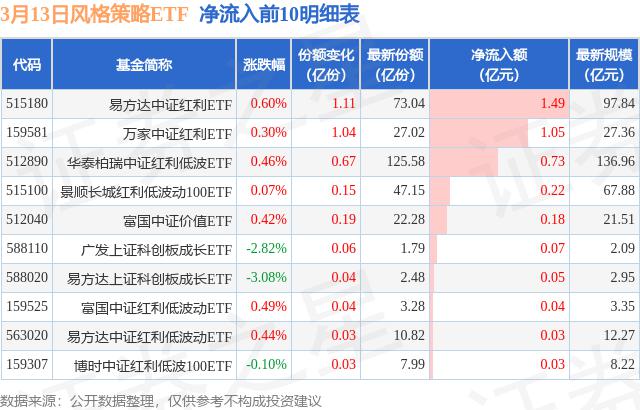 当天有 13 只风格策略 ETF 资金净流入,其中E基金净流入排名第一的是E基金中证红利。 ETF(515180),份额增加 1.11 十亿份,净流入额为 1.49 亿元。