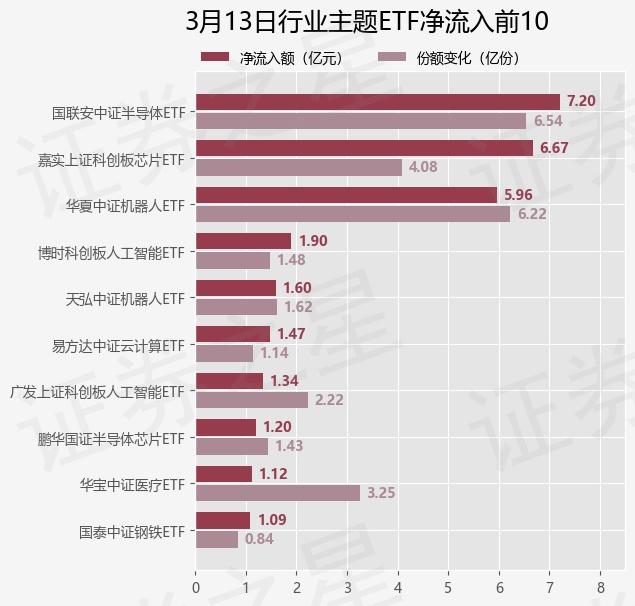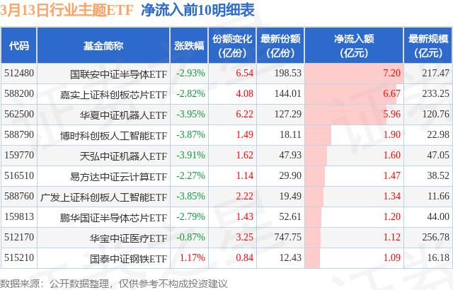 当天有 160 只行业主题 ETF 资金净流入显示,其中国联安中证半导体净流入排名第一。 ETF(512480),份额增加 6.54 十亿份,净流入额为 7.2 亿元。