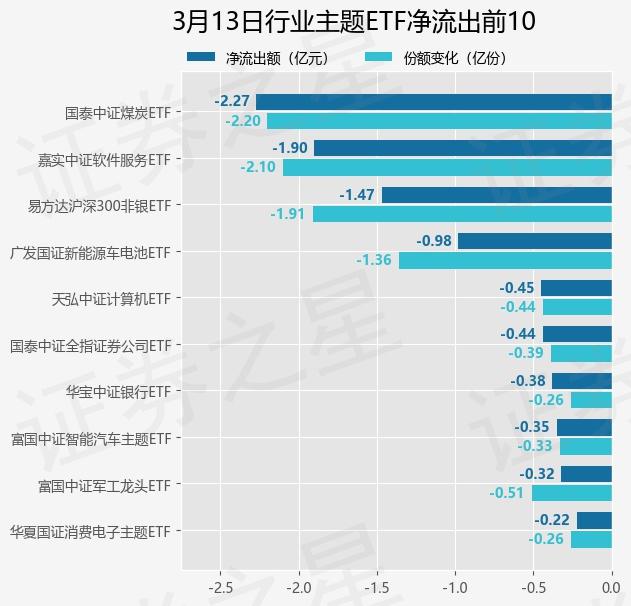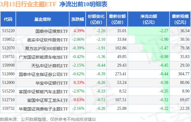 当天有 134 只行业主题 ETF 资金净流出基金,其中国泰中证煤碳净流出排名第一。 ETF(515220),份额下降 2.2 一亿份,净流出额为 2.27 亿元。