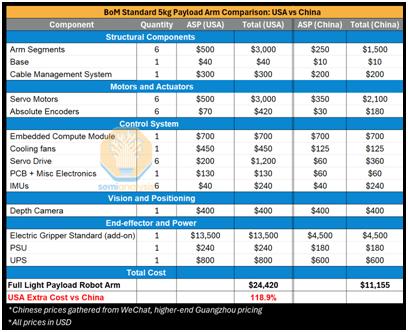 首先,报告关注的是成本问题。例如,在同等规格下,如果要在美国制造机械臂,成本将是中国制造的2.2倍。