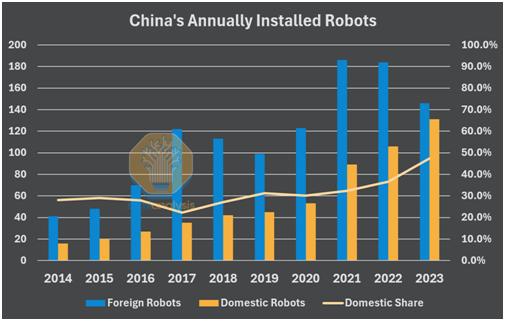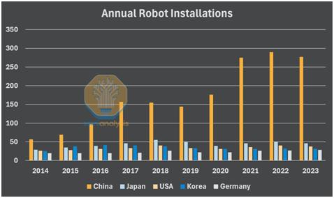 近几年来,中国在机器人领域的崛起速度引人注目。到2024年,中国的机器人安装量超过了美国、德国、日本的总和。