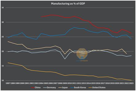 报告指出,中国的制造业能力在不断提高,机器人技术也在快速发展,这让西方“措手不及”。:韩国和日本的生育困境正在抹杀他们的制造能力。欧洲工业部门正在被中国蚕食,而美国则致力于其他市场,购买便宜的海外商品。