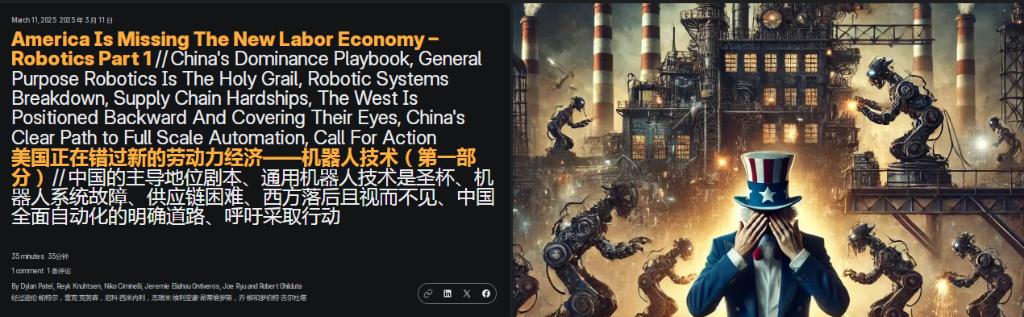 SemiAnalysis最新发布的美国著名半导体研究机构深度报告《America Is Missing The New Labor Economy – Robotics Part 第一,自动化和机器人技术正在经历一场革命,有望推动制造业和其他关键产业全面自动化,而目前,看起来只有中国有条件抓住这个历史机遇。