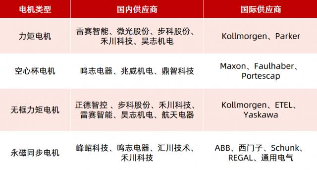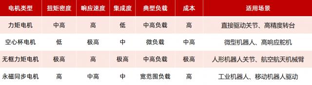 现在人形机器人中常见的电动机可以分为扭矩电动机、空心杯电动机、无框扭矩电动机和永磁同步电动机。
