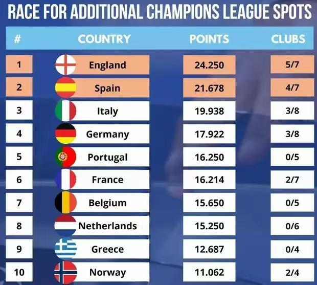 欧洲积分榜:英超领先欧冠5名,意甲追西甲机会渺茫。