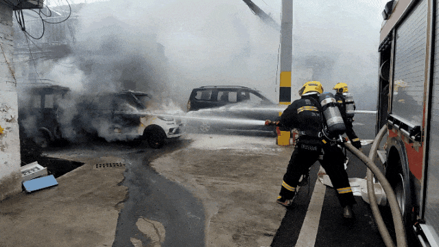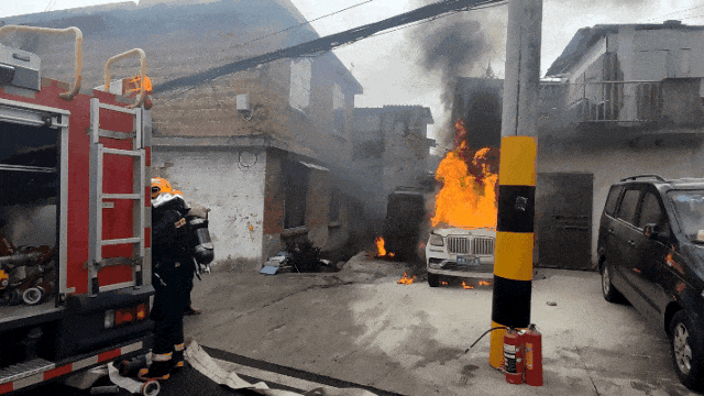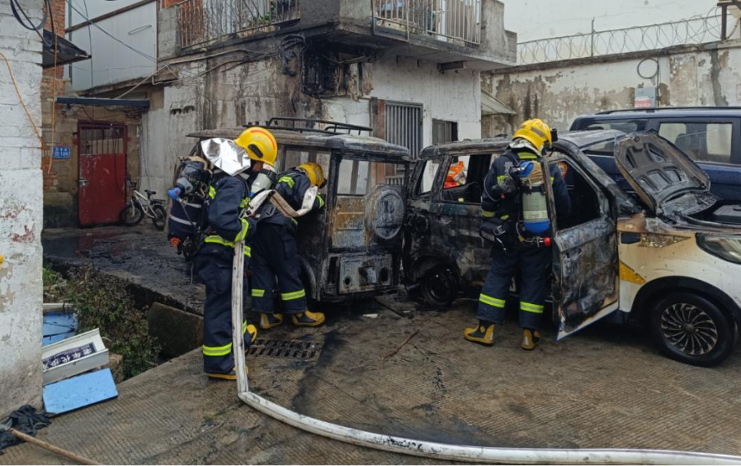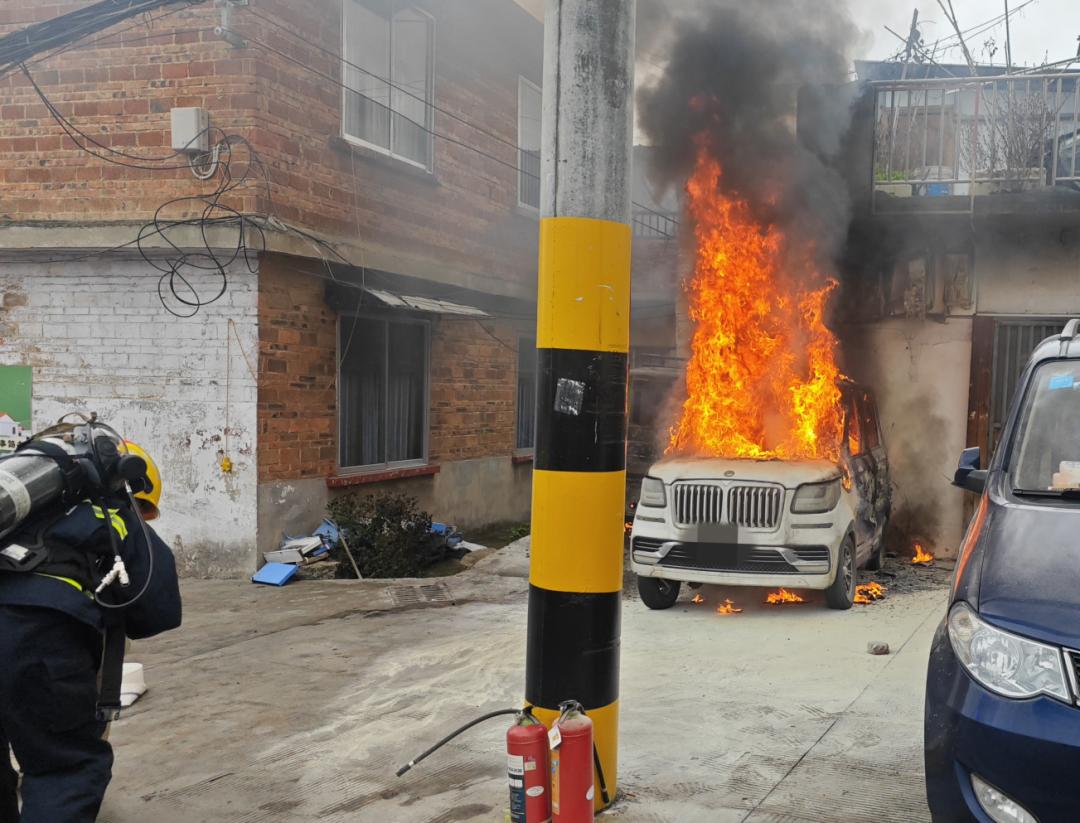 已经点燃了旁边的老年代步车,无法自行扑灭。