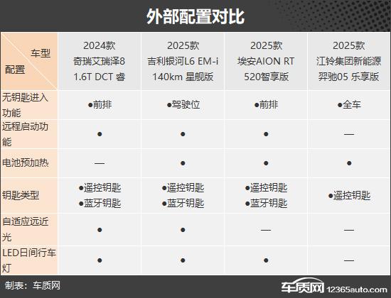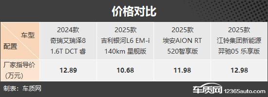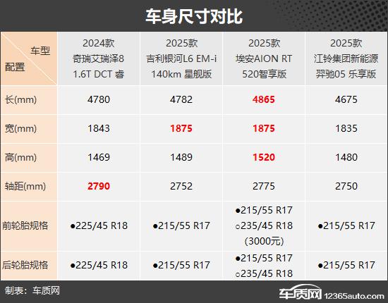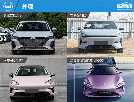 这次推荐的四款车大家一定都很熟悉,分别是奇瑞艾瑞泽。 8(以下简称:艾瑞泽 8)、吉利银河 L6(以下简称:银河: L6)、埃安 AION RT(以下简称:AION RT)和江铃集团新能源羿驰驰 05(以下简称:羿驰 05),前三款车型都有比较好的市场表现,羿驰 05 就是最近刚刚上市的全新车型。本论文将尽量选择四款车中价格相近的车进行对比,看看它们的表现如何。