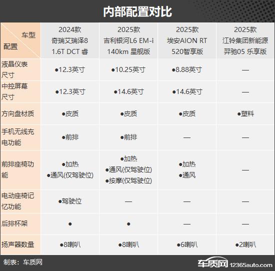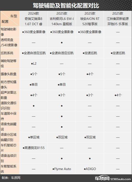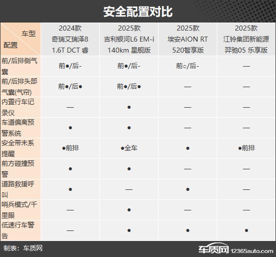 通过对比不难看出,这次推荐的四款车中,银河。 L6 综合性能比较好,安全配置,驾驶辅助配置,智能化方面比较完善。艾瑞泽 8 紧随其后,在外部配置和内部配置方面表现出色。AION RT 车内空间性能更好,车内乘坐舒适性值得肯定;而且羿驰驰 05 仅在 CLTC 在纯电续航方面有所领先,在设备方面表现不尽如人意,完全没有亮点。总的来说,除羿驰 05 另外,这次推荐的三款车型都可以满足日常家庭使用的需要,具体的选择取决于你的个人爱好。