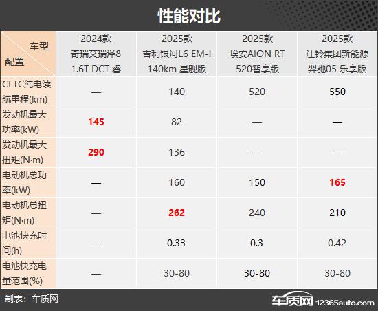 动力方面,四款车包括三种动力装置:汽油、纯电力和插电式混合动力。艾瑞泽是其中之一 8 凭着 1.6T 在发动机最大功率和最大扭矩方面,发动机优势保持领先。羿驰 05 和银河 L6 在电动机总功率和总扭距方面各有优势。此外,羿驰 05 在 CLTC 在纯电续航里程方面扳回一座城市, 550km 其它两款新能源车型的续航能力领先。补能方面,AION RT 快速充电时间最短,电池从 30% 充至 80% 只需 0.3h。