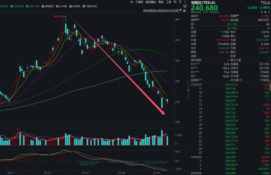 近期特斯拉股价持续下跌,抹去了自选日至今的涨幅。据欧洲汽车制造商协会统计,1月份欧洲销售额同比下降45%。尽管马斯克在美国政府中发挥了重要作用,但他已成为两极分化的政治家。自去年12月中旬创下历史高点以来,特斯拉股价累计下跌50%,市值蒸发7974亿美元,周四收盘时,特斯拉下跌近3%,报240.68美元/股。