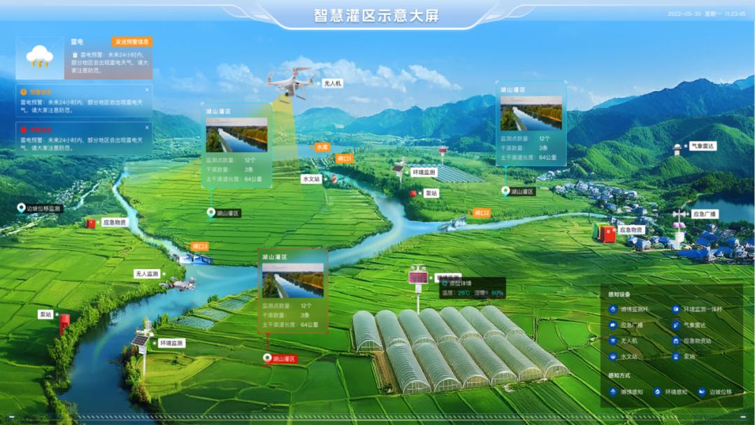 在一张电子地图上,各种监控信息,如灌区的水雨、土壤水分等。,一目了然,灌区总览、监控中心、监控中心、预警中心等多个功能模块都可以操作。乍一看,是不是有点像我们熟悉的“快乐农场”?