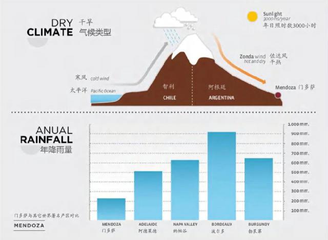 正好填补了阿根廷国土干旱、贫瘠的缺陷,为门多萨葡萄酒的生产提供了非常有利的地理环境。
