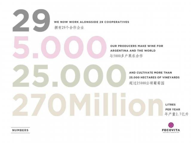 像 Fecovita 菲戈维达酒园就是这样使用的。整整 120 年度时间,结合 5000 家果农 25000 公亩葡萄园 29 国家合作企业!