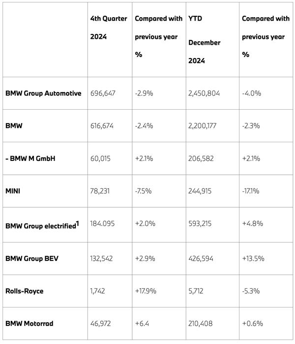 交付方面,宝马集团 2024 全年销量 245.1 万台,同比下滑 4%,在这些品牌中,宝马的销量是 220.0 万台,同比下滑 2%,MINI 品牌为 24.5 万台,同比下滑 劳斯莱斯品牌17% 5712 车辆,同比下降 5.3%。