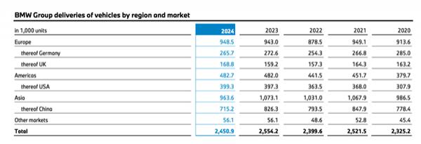 就区域而言,2024 年度宝马已经在欧洲交付 94.85 一万辆汽车,比较 2023 年 94.3 万台微增;美国市场交付 48.27 与去年基本持平的万台。