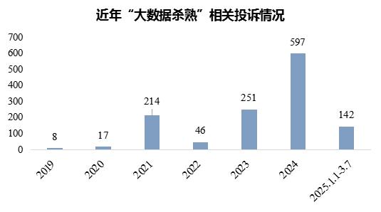 李先生的情况不是个案。根据中国电子商会旗下消费者保护平台发布的数据,2019年 年到 2025 年 3 月 7 日本,消费者保险平台已收到关于“大数据杀熟”的投诉。 1275 件,自 2025 年 1 月 1 日至 3 月 7 日,仅仅2个月就收到了。 142 件投诉。可以看出,“大数据杀熟”的状况并没有逐步改善,相反,随着技术的不断进步,呈现出高发的趋势。