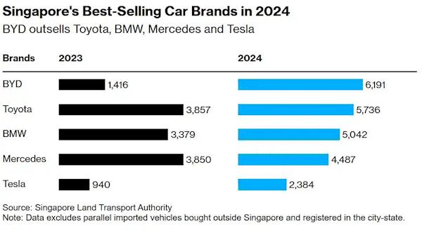 其中,丰田 2024 年度新加坡注册人数为 5736 车辆,和比亚迪有 400 另外,新加坡以前的汽车公司销售冠军也一直是丰田汽车。