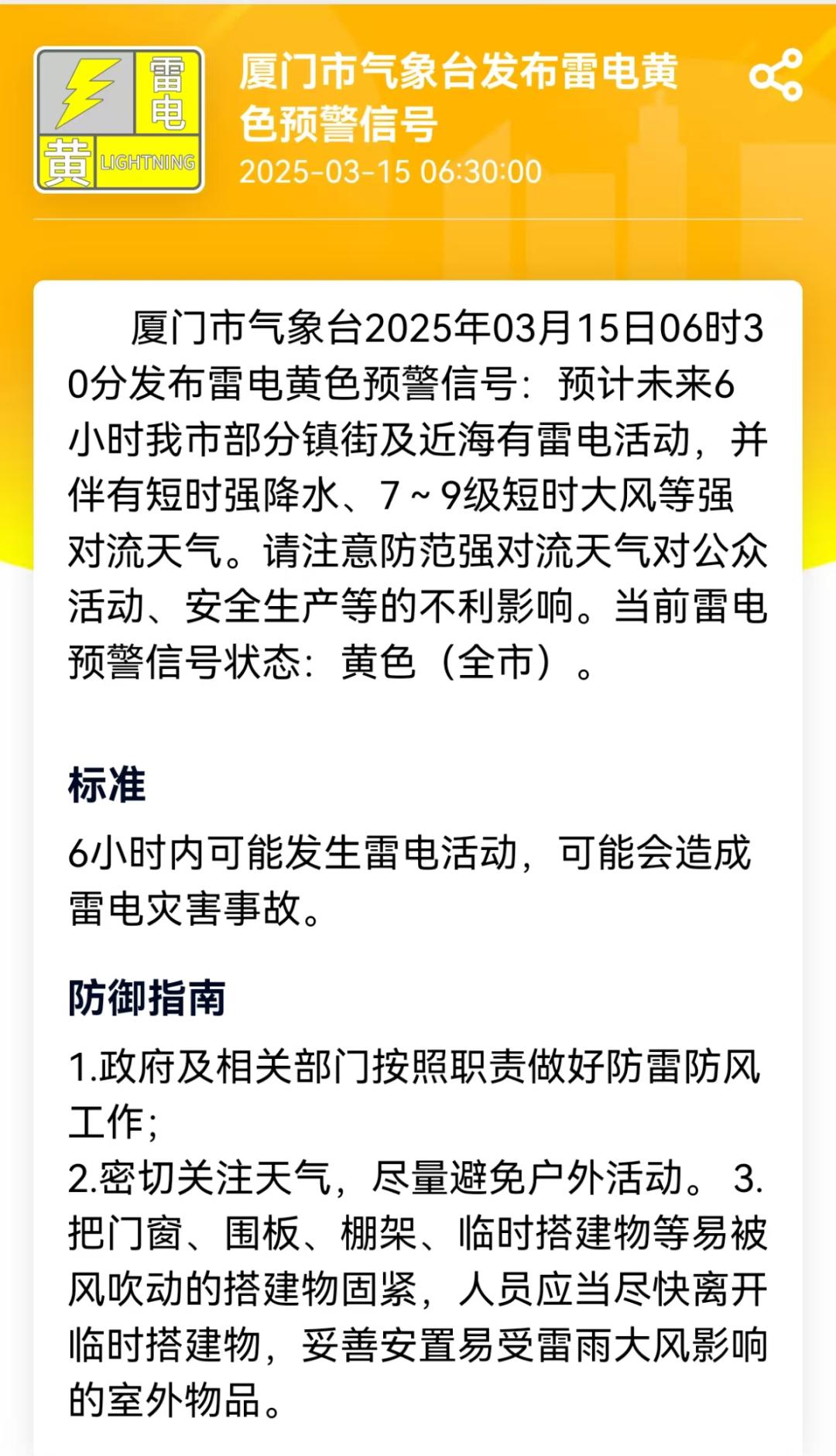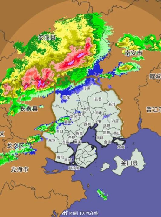 预计未来2小时(07):55—09:55)全市从西向东有短期强降水,集美区、海沧区、湖里区、思明区、同安区(美林街、新美街、西柯街、莲花镇、祥平街、新民街)、翔安区累计雨量可达15-30mm(凤翔街、新店街、金海街、大街、香山街、内厝镇、马巷街、民安街),部分雨量可达40mm,还伴有雷击、7-9级短时大风等强对流天气。其它镇街有雷雨,请注意预防!