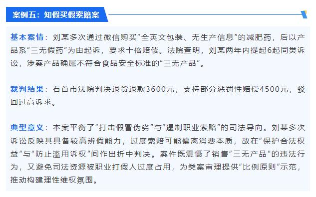 本案平衡了“打击假冒伪劣”和“遏制职业索赔”的司法取向。李某的几次诉讼反映出他辨别假货的能力很高,过多的索赔可能会转移消费本质,所以他在“保护合法权益”和“避免滥用诉讼权利”之间做出了妥协判决。案件不仅震慑了销售“三无产品”的违法行为,还防止司法资源被专业造假者过度占用,为审理类别案件提供了“比例原则”示范,促进了营造理性维权氛围。