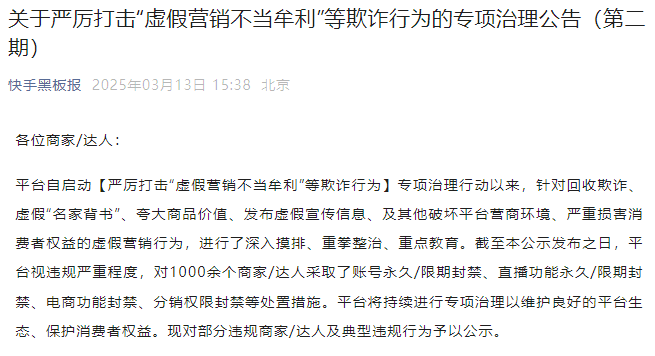 截至目前,Aautorapper已对1000多家商家/大咖采取了永久账户/时间限制、永久直播功能/时间限制、电商功能限制、分销权限限制等处置措施。