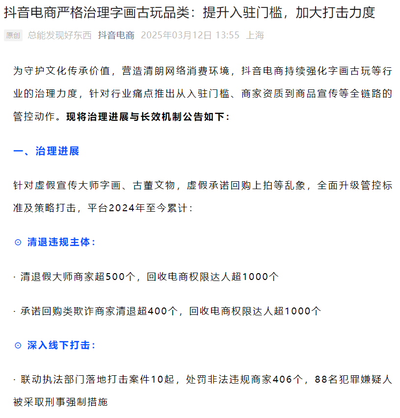 除了Aautorapper,Tiktok还在增加商家的虚假营销。比如3月12日,Tiktok电商也发布相关公告,严厉查处虚假广告大师字画、古董文物、虚假承诺回购拍卖等乱象。