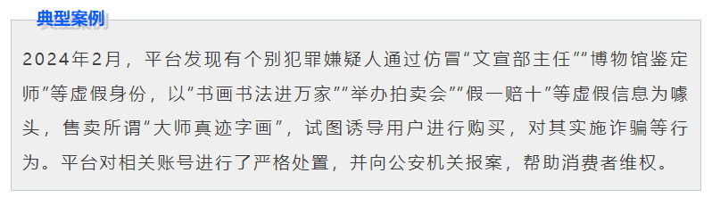 另外,还有虚假的“名家背诵”,通过虚构的“名家”、“大师”身份,或者通过“山寨协会”宣传推广书法、绘画等商品,意图夸大商品价值,诱导用户下订单。