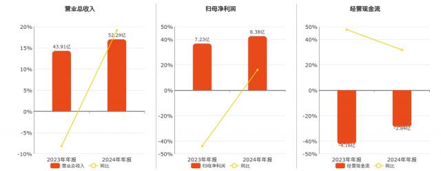 企业总营业收入为 52.29 亿元。归母净利润为 8.38 十亿元。经营活动现金净流入 -2.84 亿元。