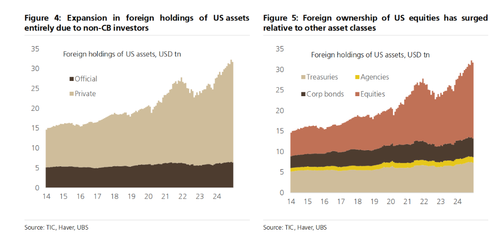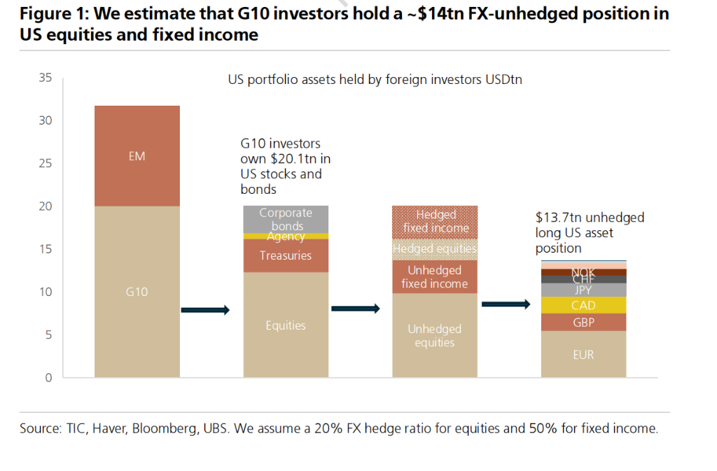 各种因素正在动摇过去十年建立的对美国资产的过度配置。瑞银指出,美国没有对冲资产的风险约为14万亿美元。预计如果外资减持5%,会导致美元销售7000亿美元。