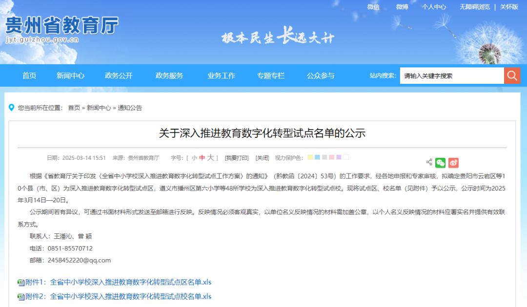 原标题:贵州中小学深入推进教育数字化转型试点名单公示