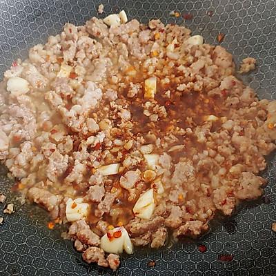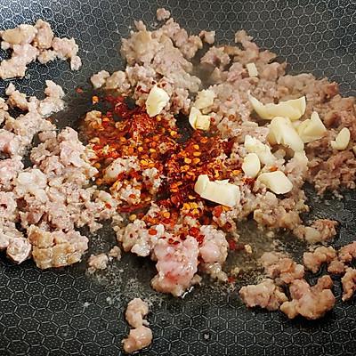1、开火热锅加点油下肥瘦肉馅,随意加点蒜蓉粗辣面。