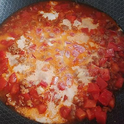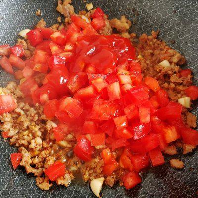 3、看着锅里没有水,扔上漂亮的番茄丁加番茄酱。 / 膏 / 罐头 / 沙司补色补口