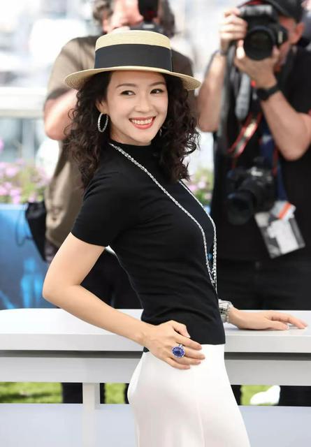 那天,章子怡穿着一套奢侈的西装出现了。她的上半身是一套短西装,里面是透视黑纱,下半身是天鹅绒短裙。她的腿露在外面,脖子、手腕和手指上有金珠。