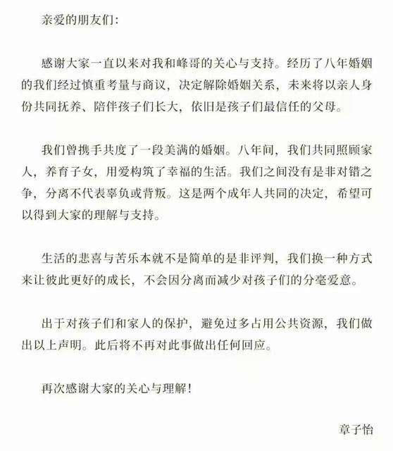 2023 年 10 月,章子怡和汪峰断绝了八年的恋情,一起详细声明,没有对错。分离并不意味着失望或背叛。冷静体面地结束了这段感情,彻底切断了谣言被盲目传播的可能性。