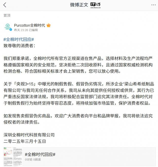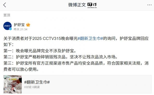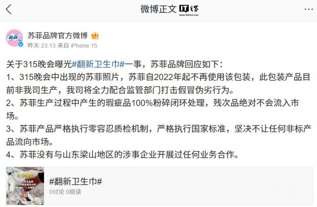 现在苏菲、棉花时代等品牌已经 2025 年 315 在晚会上曝光了劣质卫生巾、婴儿纸尿裤等问题,IT 家族附属声明内容如下: