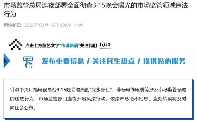 IT 世家 3 月 16 国家市场监管总局今天凌晨发文称,针对中央广播电视总台, 3・15 晚会上曝光的“锁水虾”、涉及市场监管领域的非标电线电缆等违法行为,市场监管部门连夜执法,依法严惩,不原谅,查处结果将及时向社会公布。。