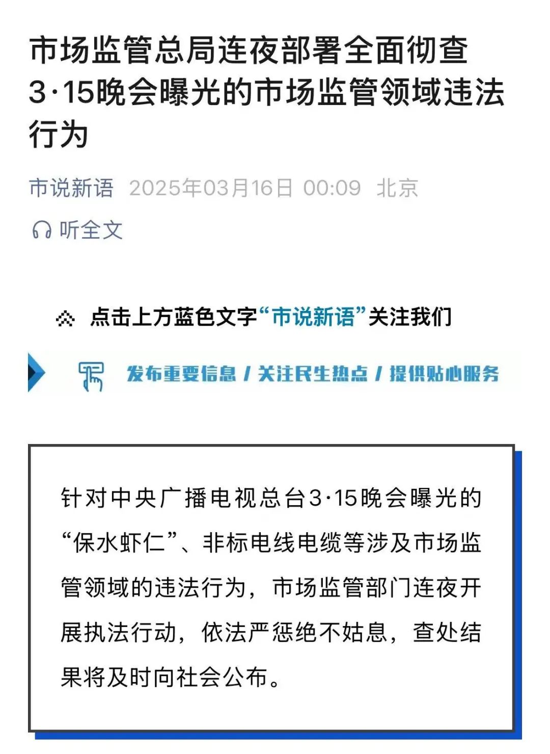 市场监管总局官方微信“市说新语”刚刚发布消息,针对中央广播电视总台3月15日晚会曝光的“锁水虾仁”、涉及市场监管领域的非标电线电缆等违法行为,市场监管部门连夜执法,依法严惩,不原谅,查处结果将及时向社会公布。