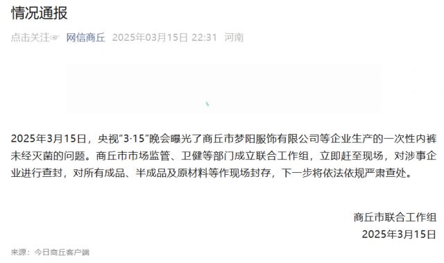 2025 年 3 月 15 日,央视" 3・15 “晚会曝光了商丘市梦阳服装有限公司等企业生产的一次性内衣未经消毒的问题。商丘市市场监管、卫生健康等部门成立了联合工作组,立即赶到现场。查封涉案企业,现场保存所有成品、半成品、原材料等。,下一步将依法严厉查处。